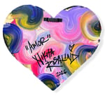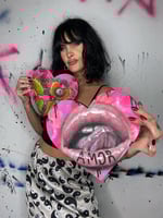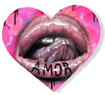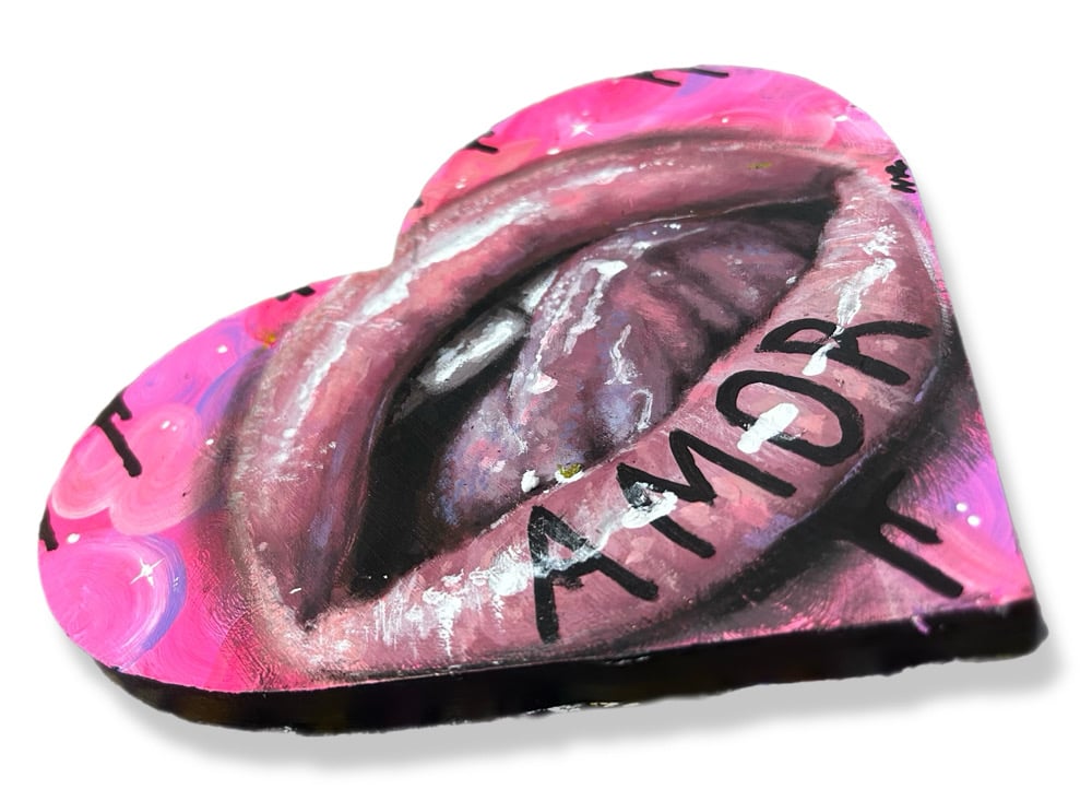 Lovely Dovey vibes with this pink heart shaped piece. Realistic painted lips with “AMOR” on the bottom. Black drippy details and hidden pink waves, create interesting texture.