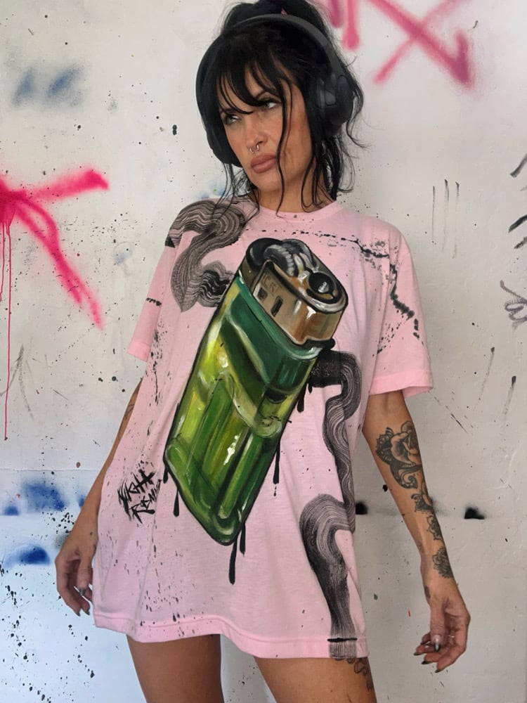 • This custom art tee is a beautiful wearable painting! A weird little badass shirt. I painted a huge green lighter on this piece with my black waves. Love how this looks!
