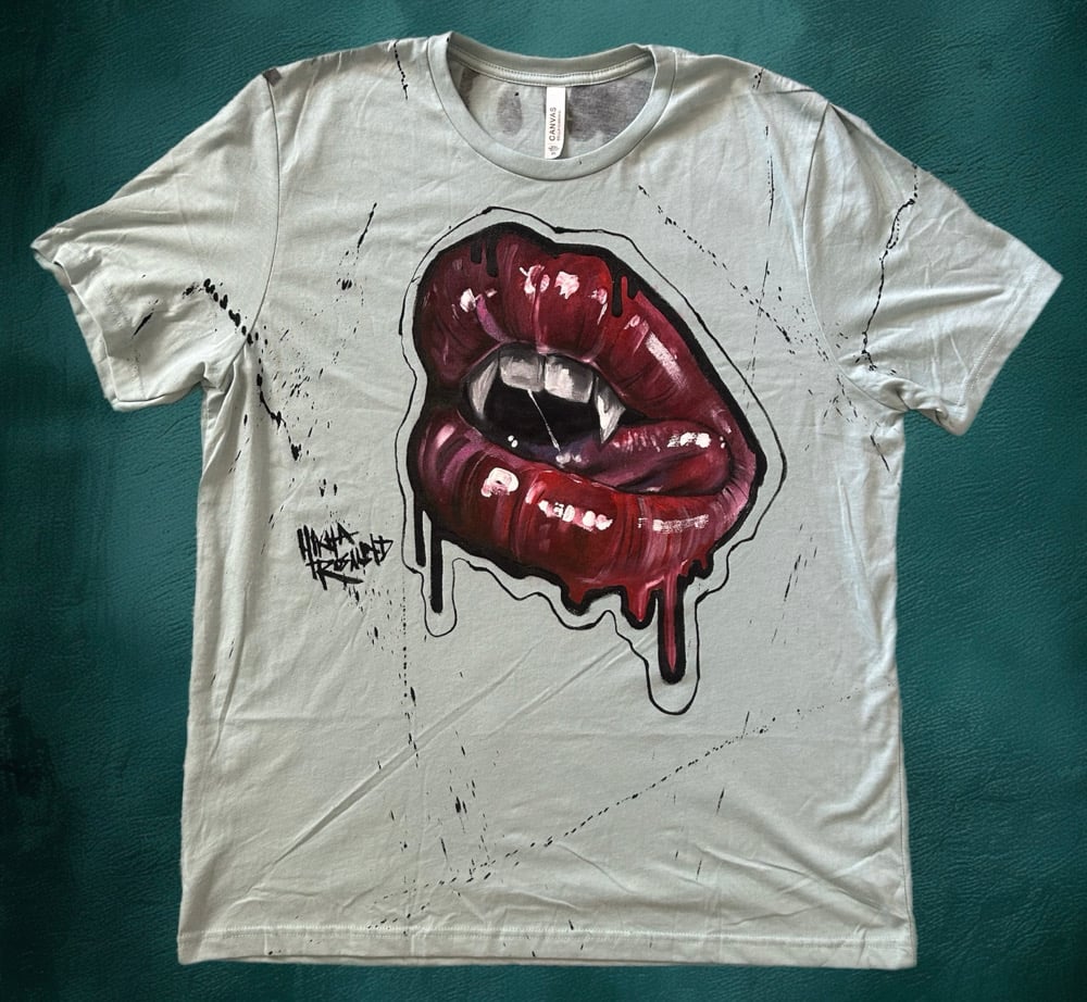 • This custom art tee is such a lovely wearable painting. My favorite vampy lips design, love the dark crimson tones on this light teal colored shirt.