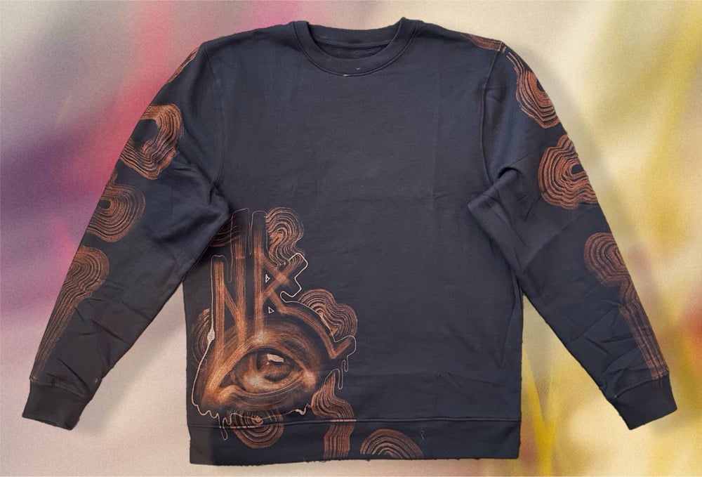 “BONED” One of a kind bleach painted pullover sweater with fleece interior. Created by Nikita Rosalind November 18th 2025