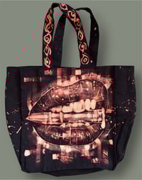 • "BITE THE BULLET" One of a kind bleach painted black canvas tote bag. Created by Nikita Rosalind July 29th 2024