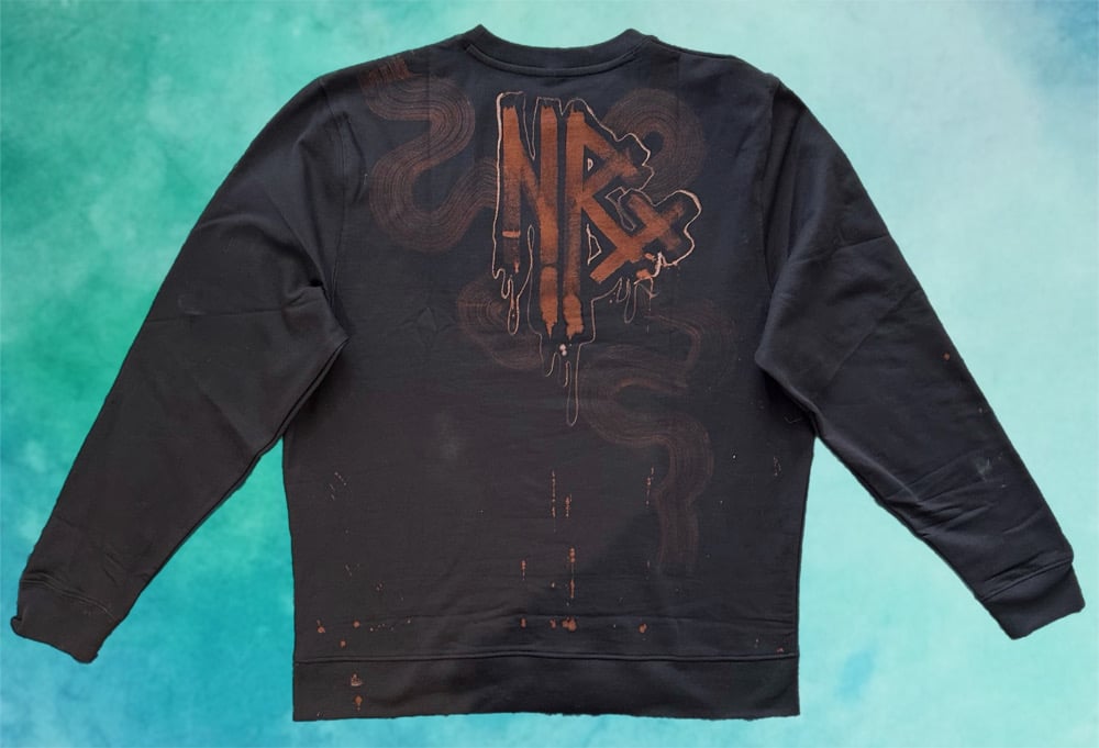 “CRYING WAVES” One of a kind bleach painted pullover sweater with fleece interior. Created by Nikita Rosalind November 12th 2025