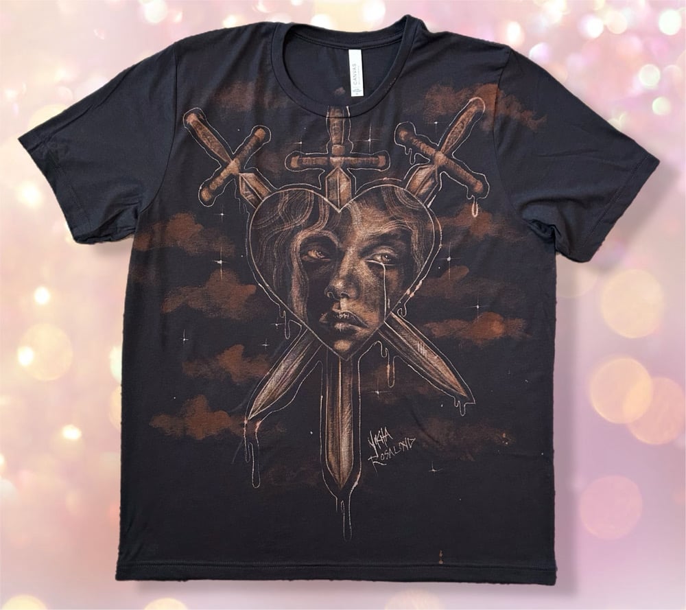 • “CUT THROUGH THE HEART" One of a kind hand painted T-shirt. Created with bleach by Nikita Rosalind June 24th 2025