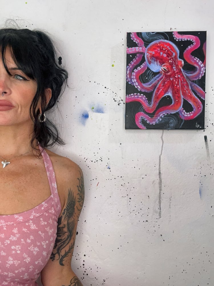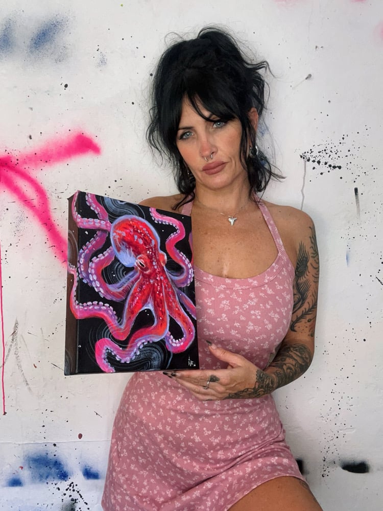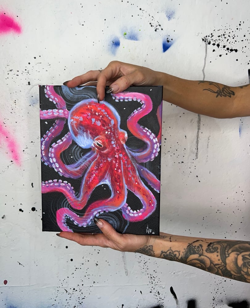 • The bright cotton candy colored little octopus pops on the deep dark black. I love how the tentacles wrap around the canvas bringing it to life.