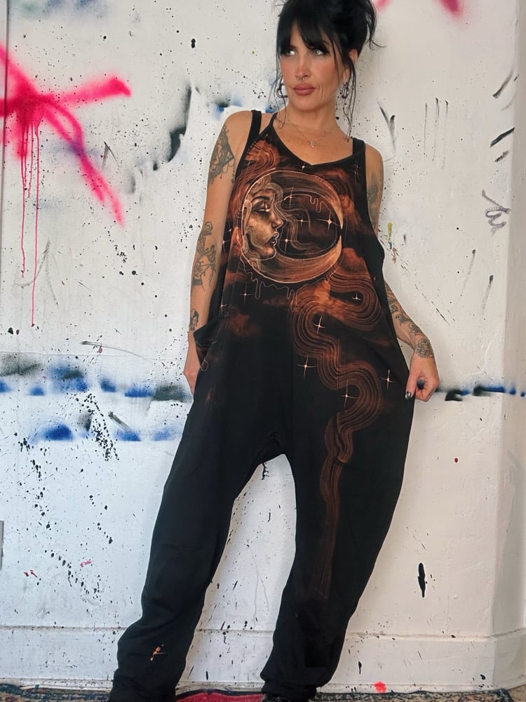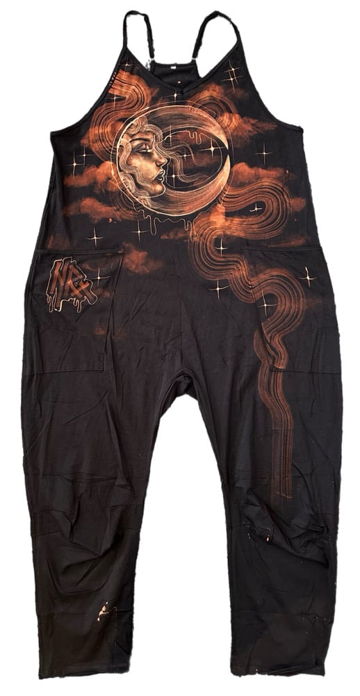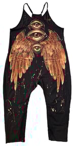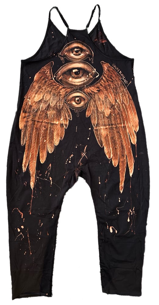 • Art you can wear! Free hand bleach painted baggy oversized romper. I just want to create all my pieces with wings! I love how magic and lovely this one is. I know you’ll feel like a goddess wearing it. Signed on the back.