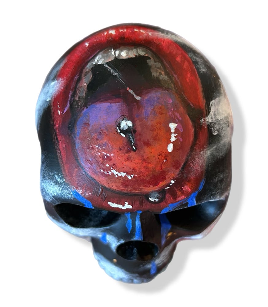 • "FREAKY" painted small Reno’s skull. This piece is dark and moody, a open mouth with the tongue out on the center on the skull. Black background with fluffy white clouds.