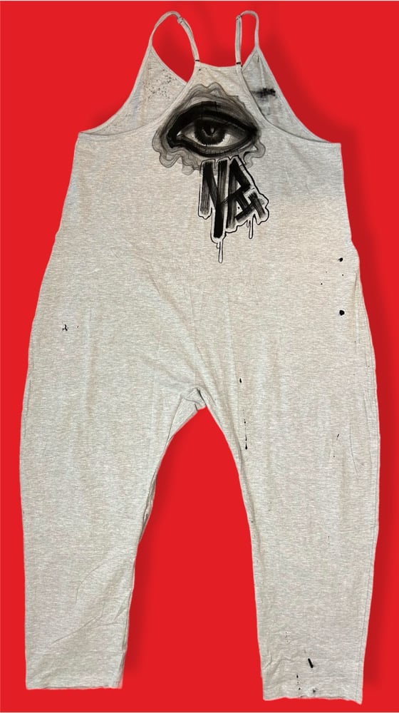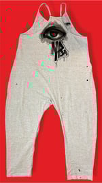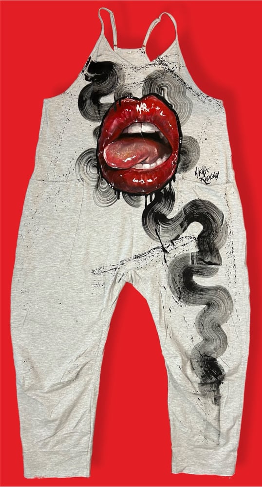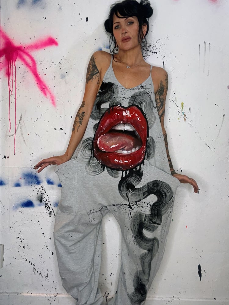 • “GIVE’EM LIP” One of a kind hand painted oversized romper. Created with fabric textile paints by Nikita Rosalind September 8th 2025