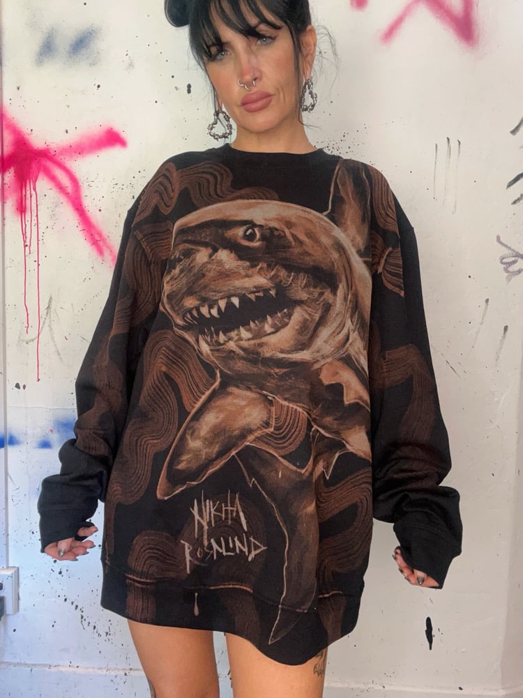 • Amazing custom bleach painted long sleeve fleece interior pullover sweater. Exposure therapy anyone? We love this textural shark piece and tons of my beautiful waves on the front and down the sleeves. signed on the front.