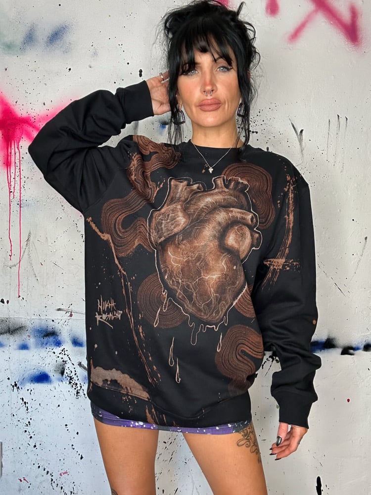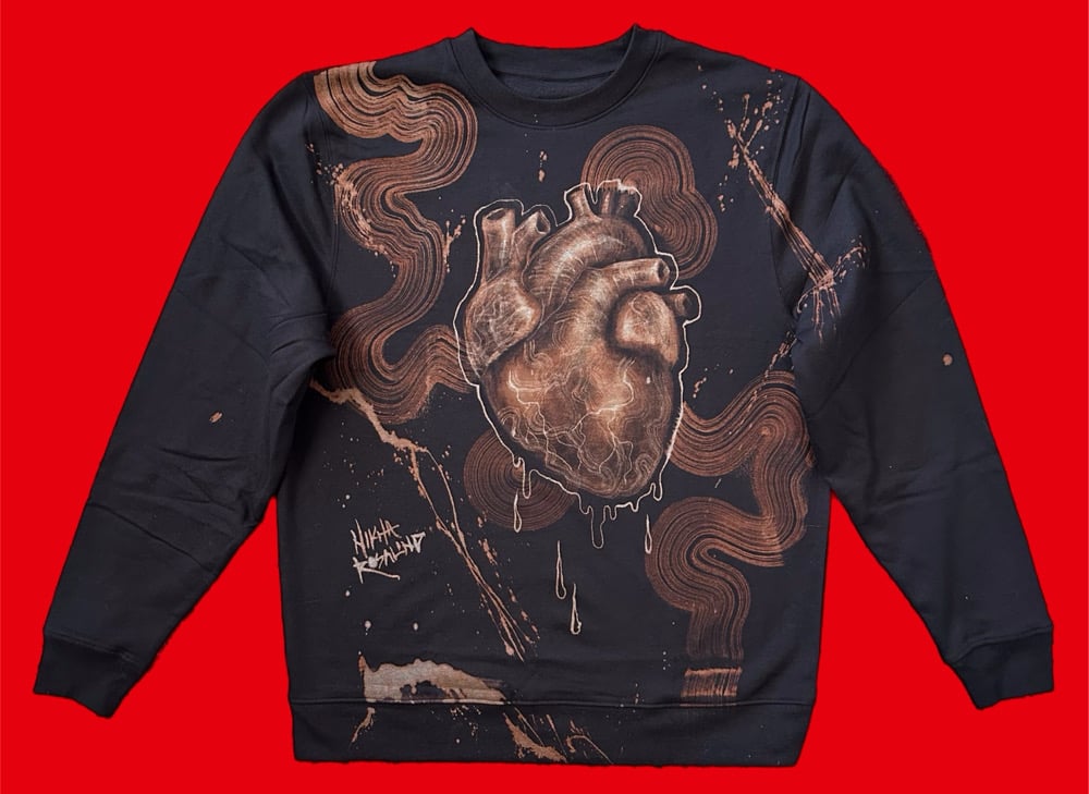 • Amazing custom bleach painted long sleeve fleece interior pullover sweater. Painted a realistic huma heart on this piece, love the waves around it. Sick piece! Signed