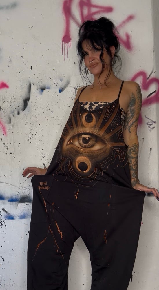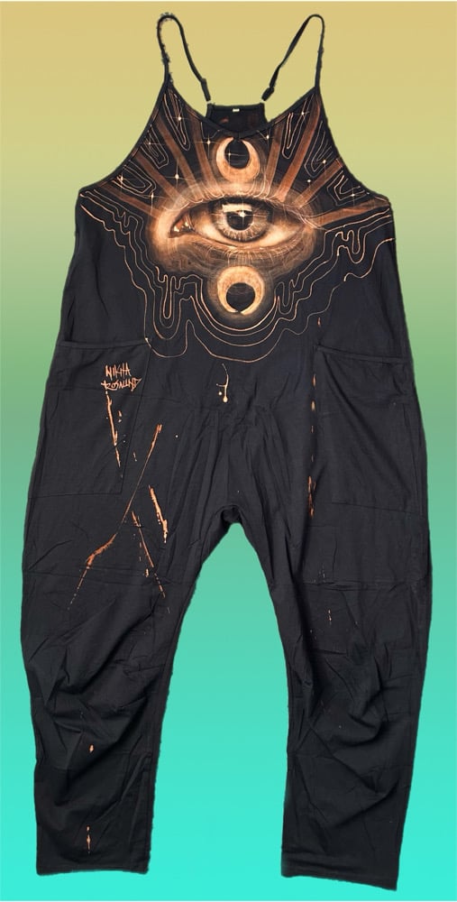 • Art you can wear! Free hand bleach painted baggy oversized romper. This piece is angelic! Beautiful wing on the back, an all knowing eye design on the front.