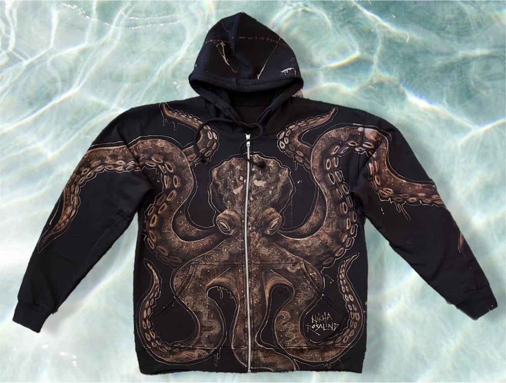 “INTO THE DEEP” One of a kind bleach painted zipper hoodie with soft fleece interior. Created by Nikita Rosalind September 24th 2025