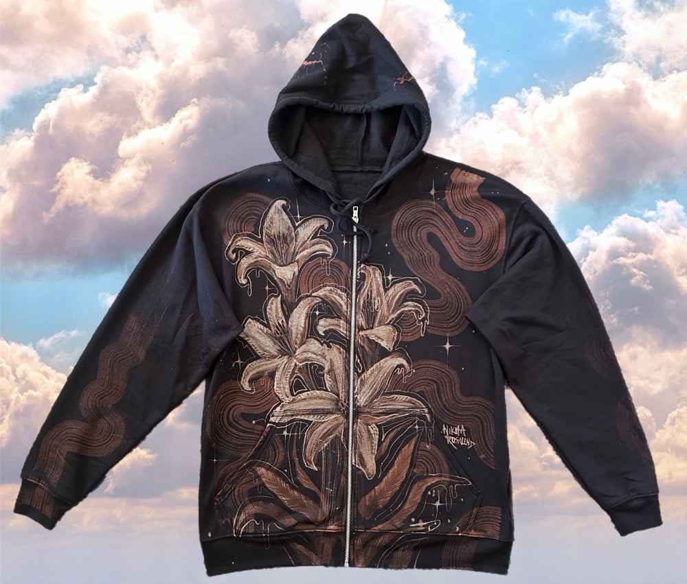 “LILIES” One of a kind bleach painted zipper hoodie with soft fleece interior. Created by Nikita Rosalind December 19th 2025