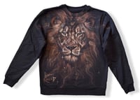 • Amazing custom bleach painted long sleeve fleece interior pullover sweater. A beautiful detailed and majestic lion free hand painted on the front. I added waves in the mane for some extra magic. signed on the front.