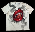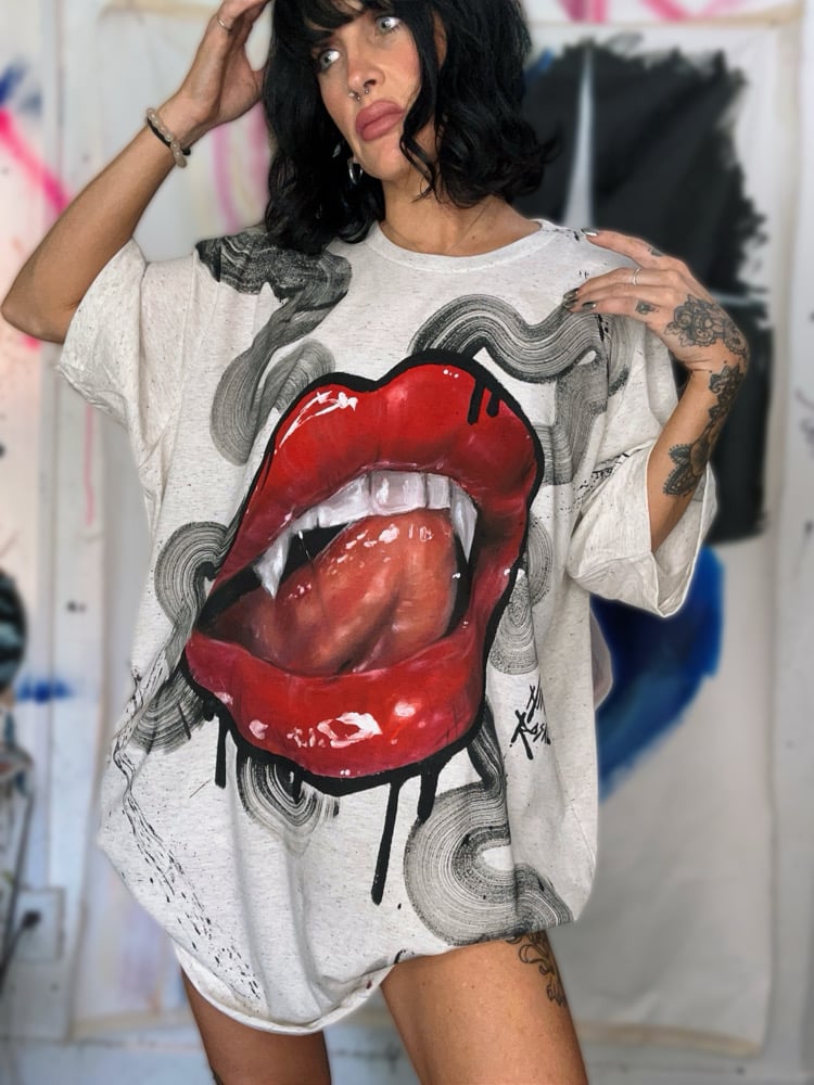 • This custom art tee is a beautiful wearable painting! This piece will have you feeling the vampy vibes. Love this super bright red lips on the front with my signature black waves.