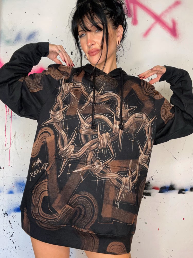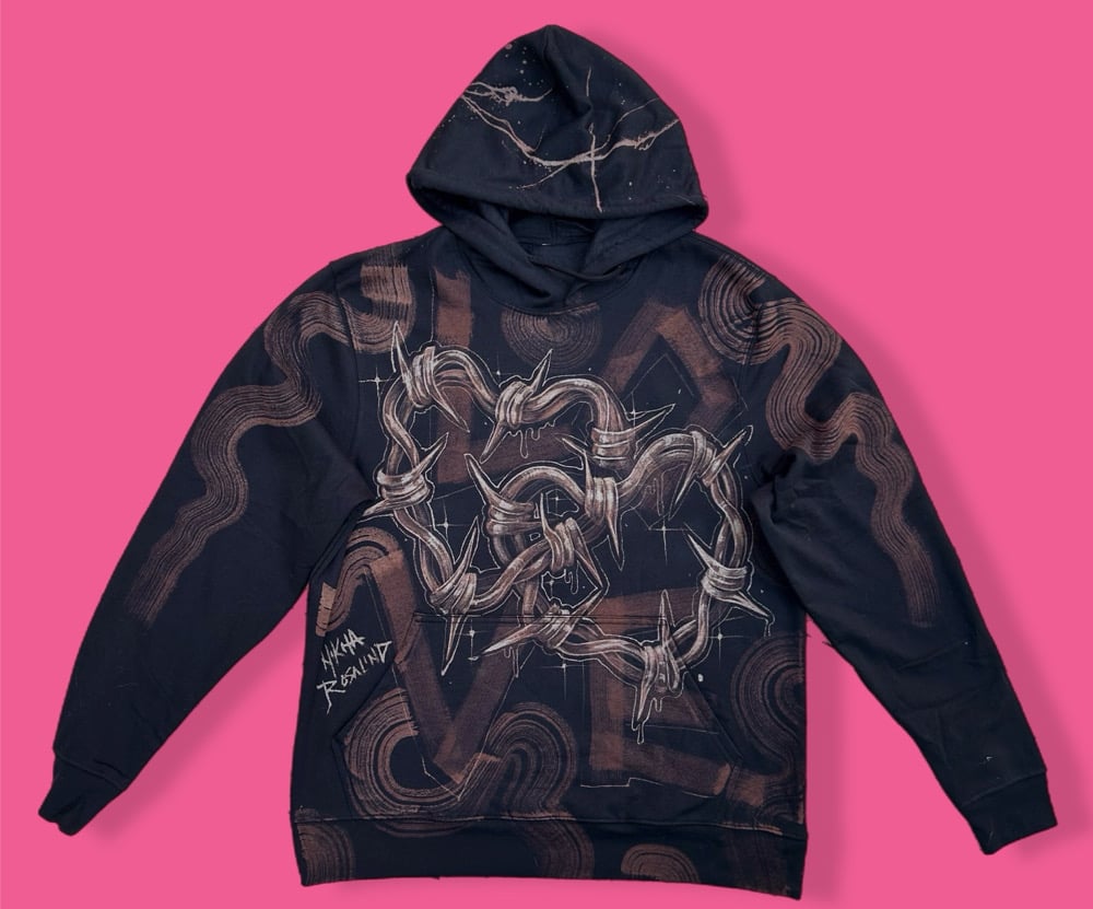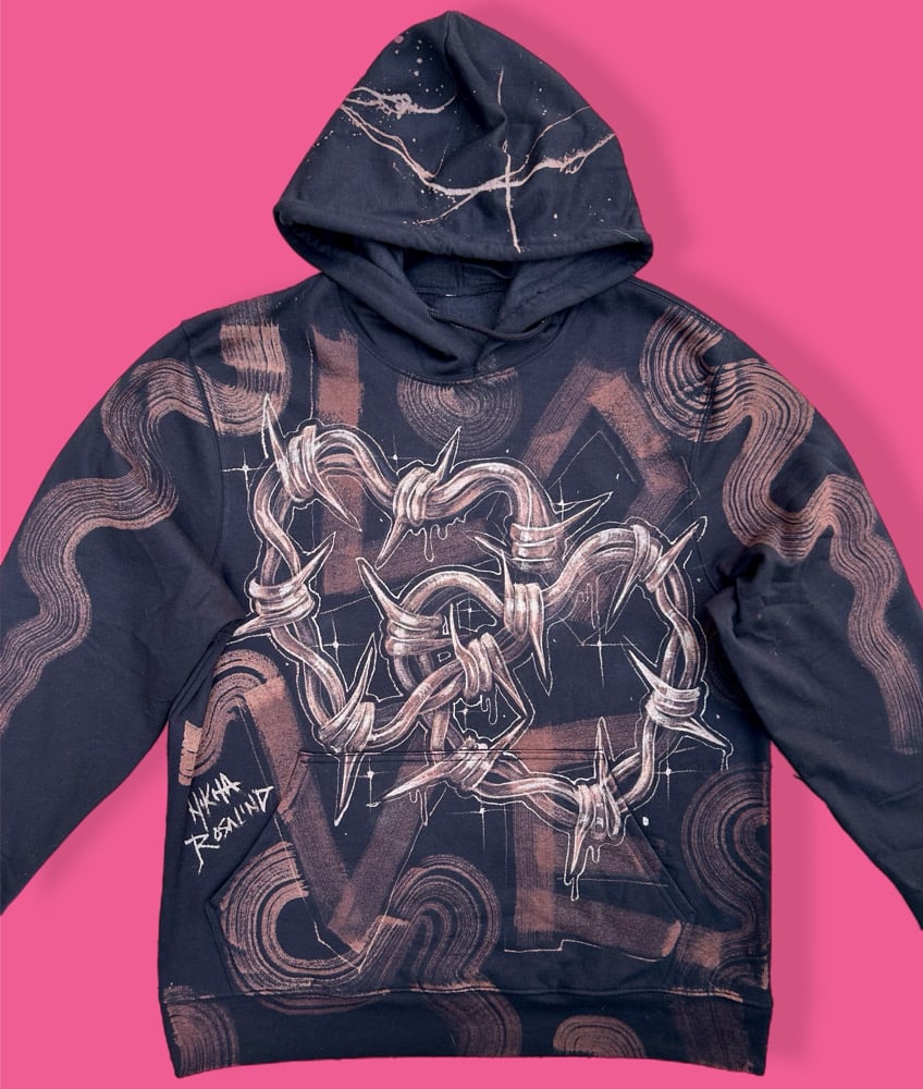 “LOVE” One of a kind bleach painted pullover hoodie with soft fleece interior. Created by Nikita Rosalind January 3rd 2025