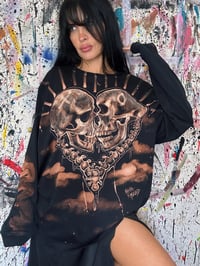 • Art you can wear! Amazing custom bleach painted art tee. This tee is a baddie with two kissing skeletons in the shape of a heart. Amazing red shaded clouds add to the spooky love scene. Waves on the sleeves, NR eye on the back. Signed