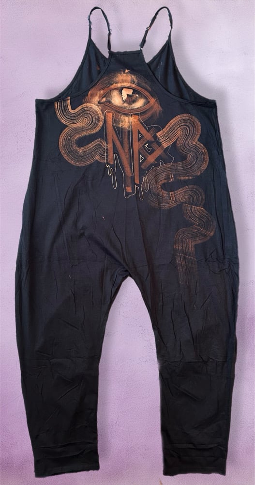 • Art you can wear! Free hand bleach painted baggy oversized romper. Beautiful Medusa portrait piece. NR eye and waves on the back. Signed on the front.