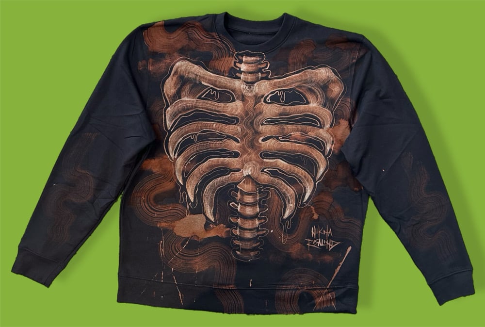 “MONSTERA RIBCAGE” One of a kind bleach painted pullover sweater with fleece interior. Created by Nikita Rosalind November 10th 2025