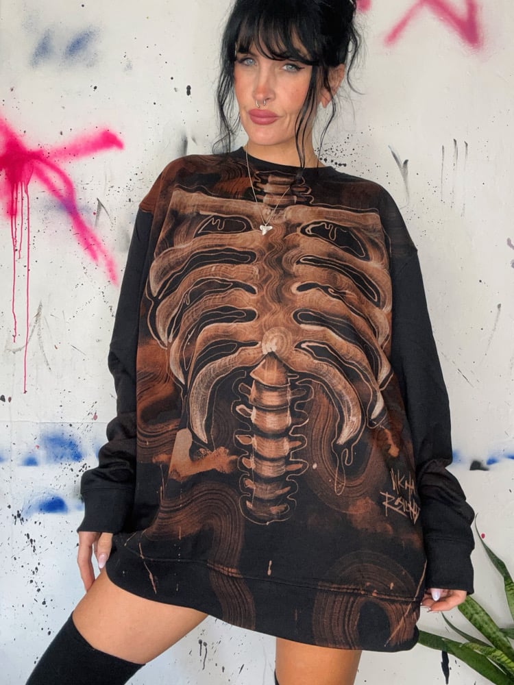 • Amazing custom bleach painted long sleeve fleece interior pullover sweater. Monstera looking ribcage on the front of this piece. Such a bad ass looking piece, so much texture and linework to create the shading.