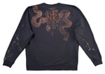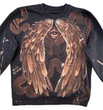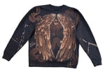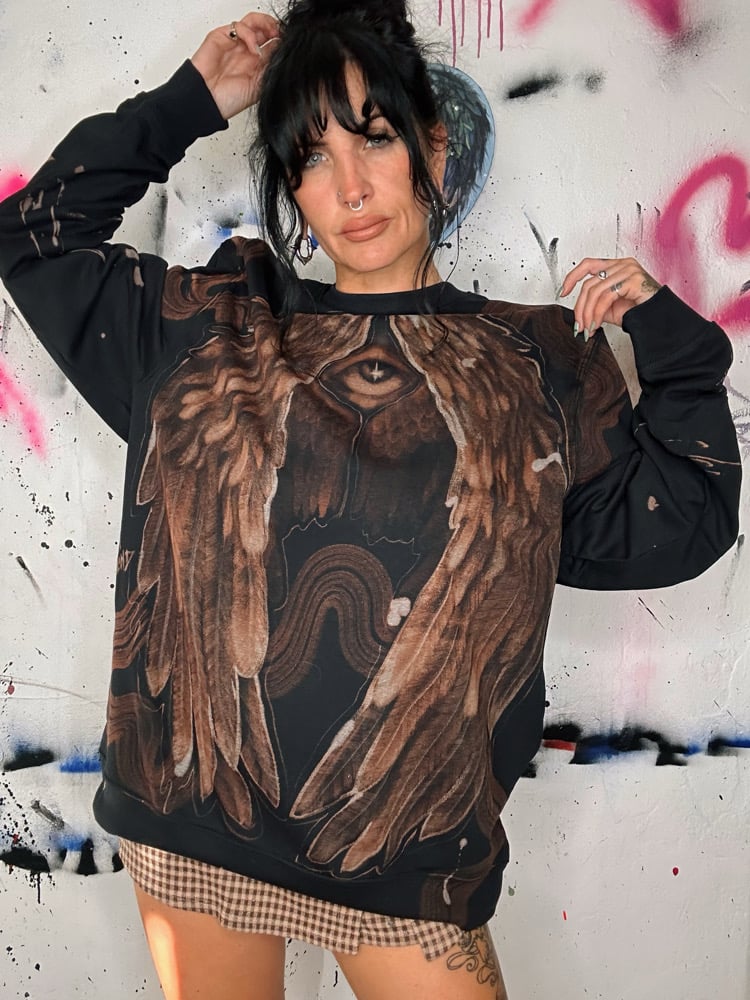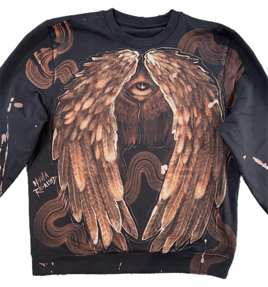 • Amazing custom bleach painted long sleeve fleece interior pullover sweater. Moving through dimentions as though we have wings. Splatters on the sleeves. Signed