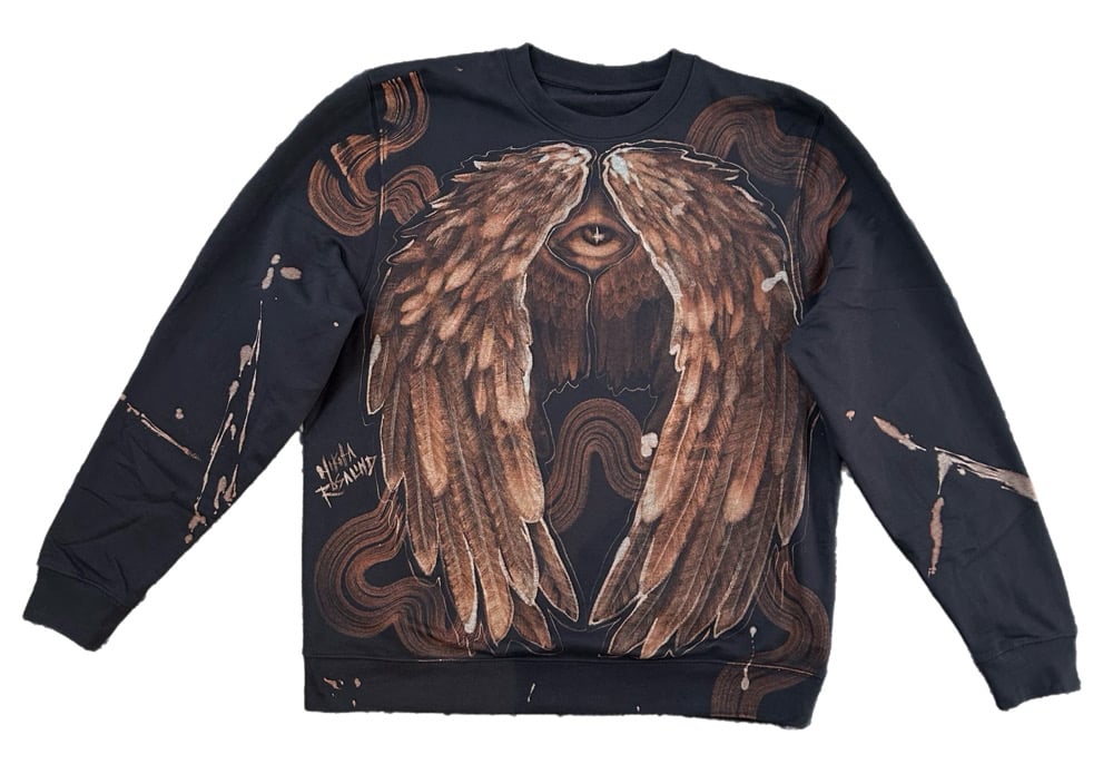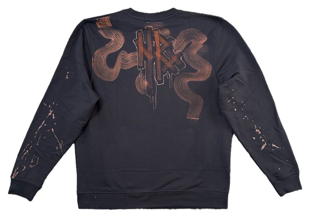 “MOVING THROUGH DIMENTIONS” One of a kind bleach painted pullover sweater with fleece interior. Created by Nikita Rosalind April 9th 2026