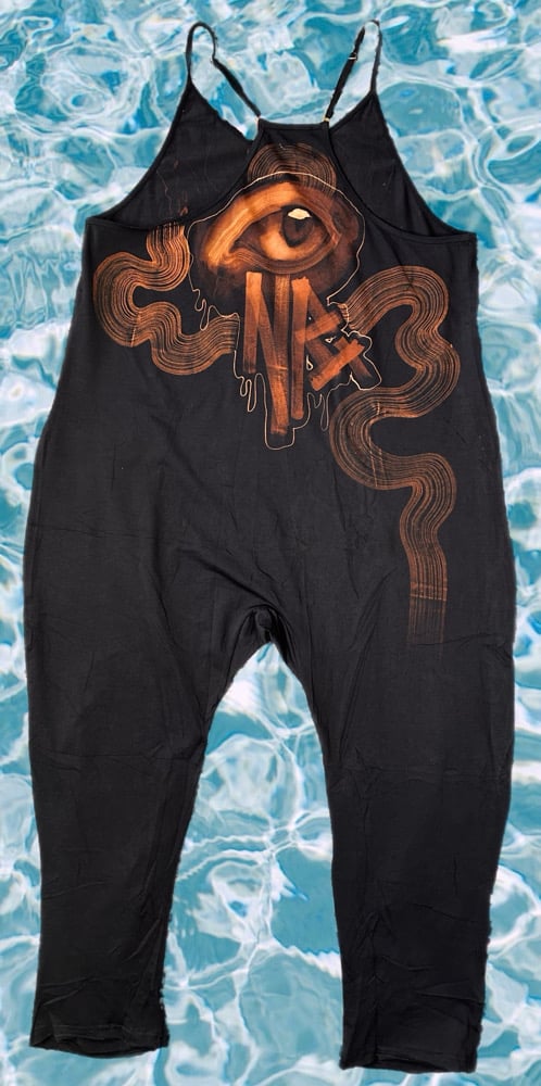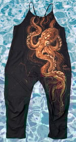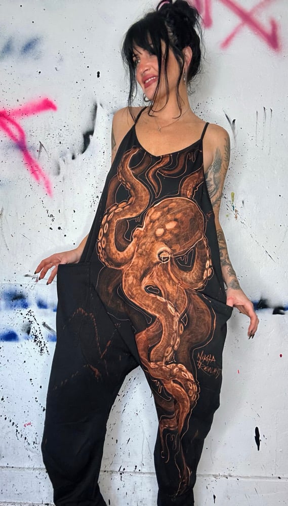 • Art you can wear! Free hand bleach painted baggy oversized romper. One of my favorite creatures to paint, this beautiful octopus on the whole side of the front. NR eye and waves on the back. Signed.