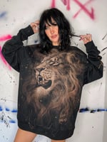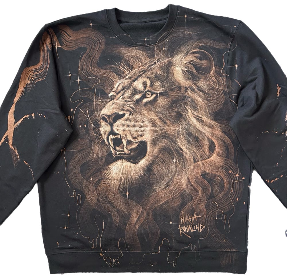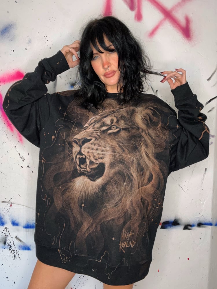 “LION HEART” One of a kind bleach painted pullover sweater with fleece interior. Created by Nikita Rosalind December 29th 2025
