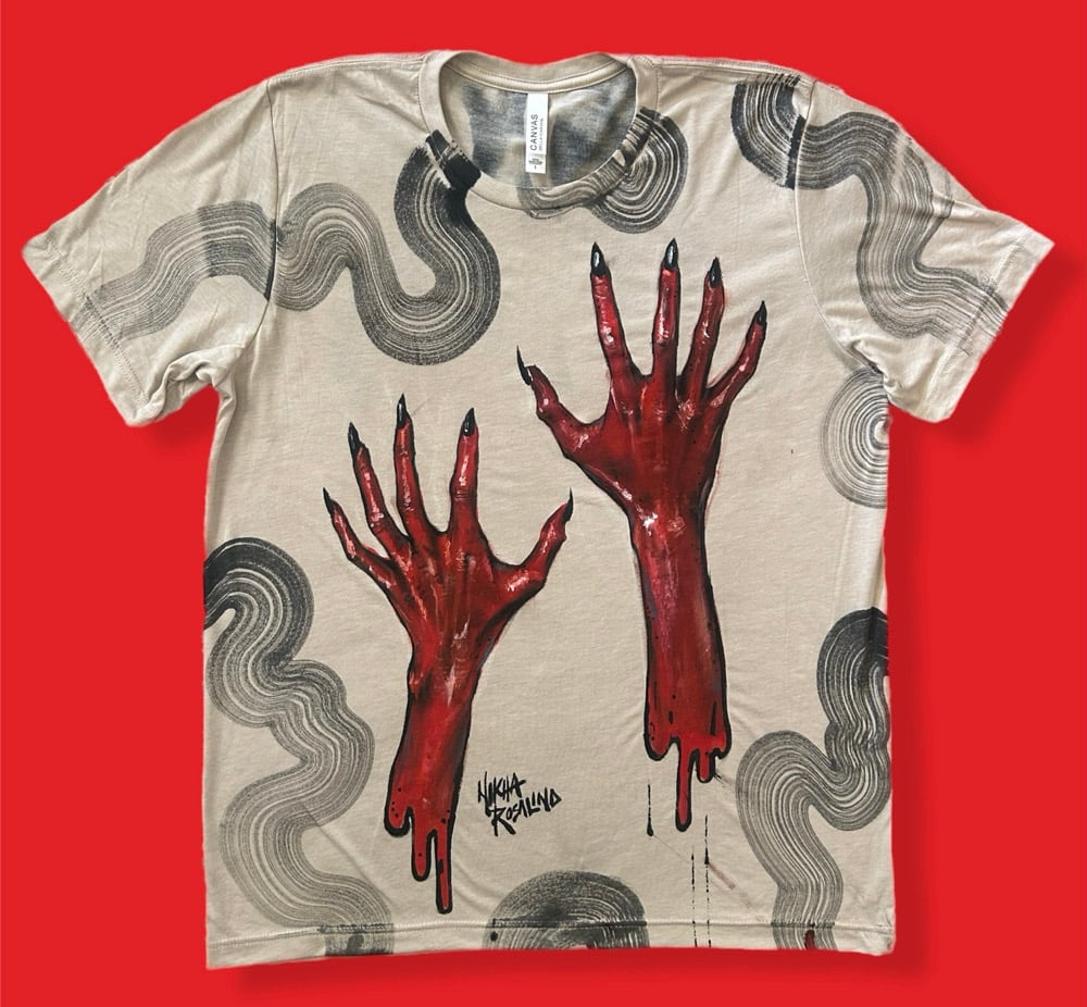 • This custom art tee is a beautiful wearable painting! This piece is so unique! Creepy red hand reach up and my signature black waves perfectly placed around the tee.