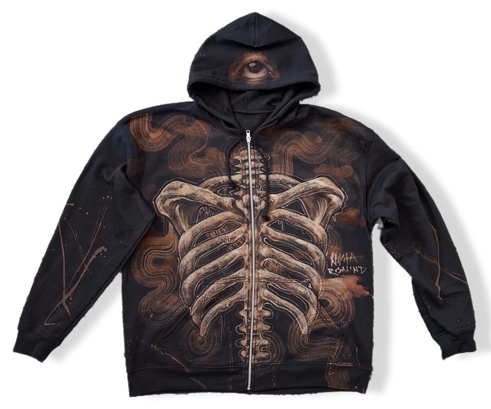 “RIB CAGE” One of a kind bleach painted zipper hoodie with soft fleece interior. Created by Nikita Rosalind November 7th 2025