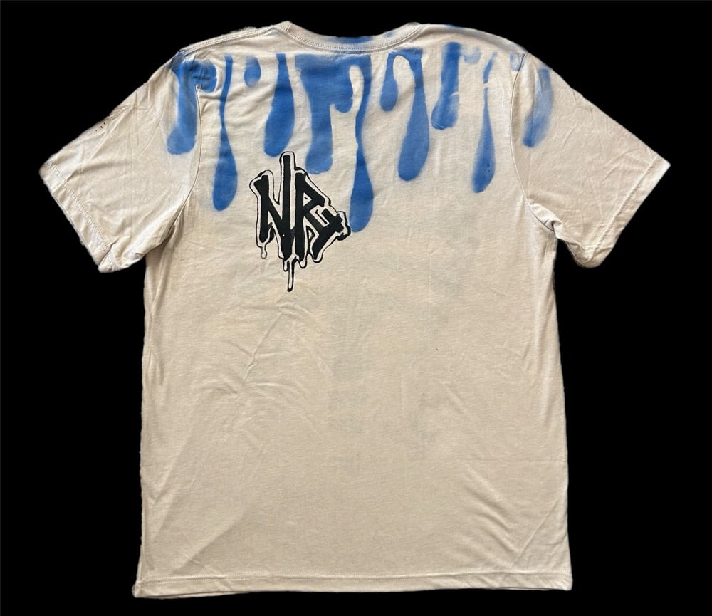 • This custom art tee is a wearable work of art. A cross between ribs and a monstera leaf. Signed by me on the front! Blue spray painted drips on the back.