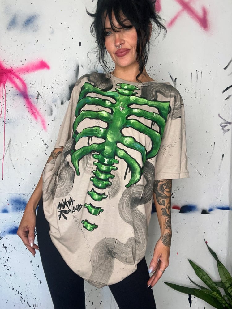 “RIBS OF MONSTERS” One of a kind hand painted T-shirt. Created with fabric textile paints by Nikita Rosalind November 13th 2025
