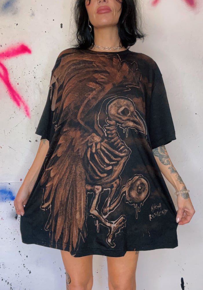 • This custom art tee is a beautiful wearable painting! Super cool piece with a bony scavenger bird on the front, he ran away with your eye.