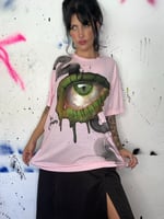 • This custom art tee is a beautiful wearable painting! We love this beautiful emerald eye of a witch piece. The colors are so crisp and amazing on the light pink of the shirt.