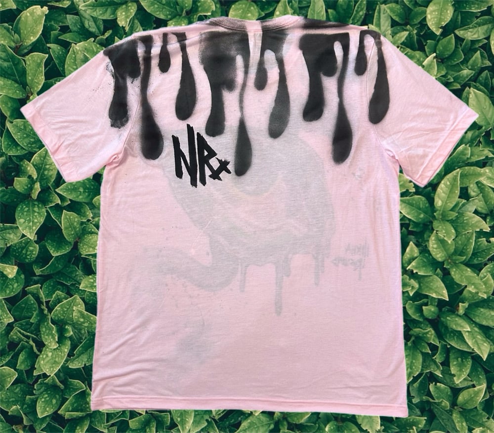Signed on the front, NR on the back with black a spray painted stencil drips on the shoulders.
