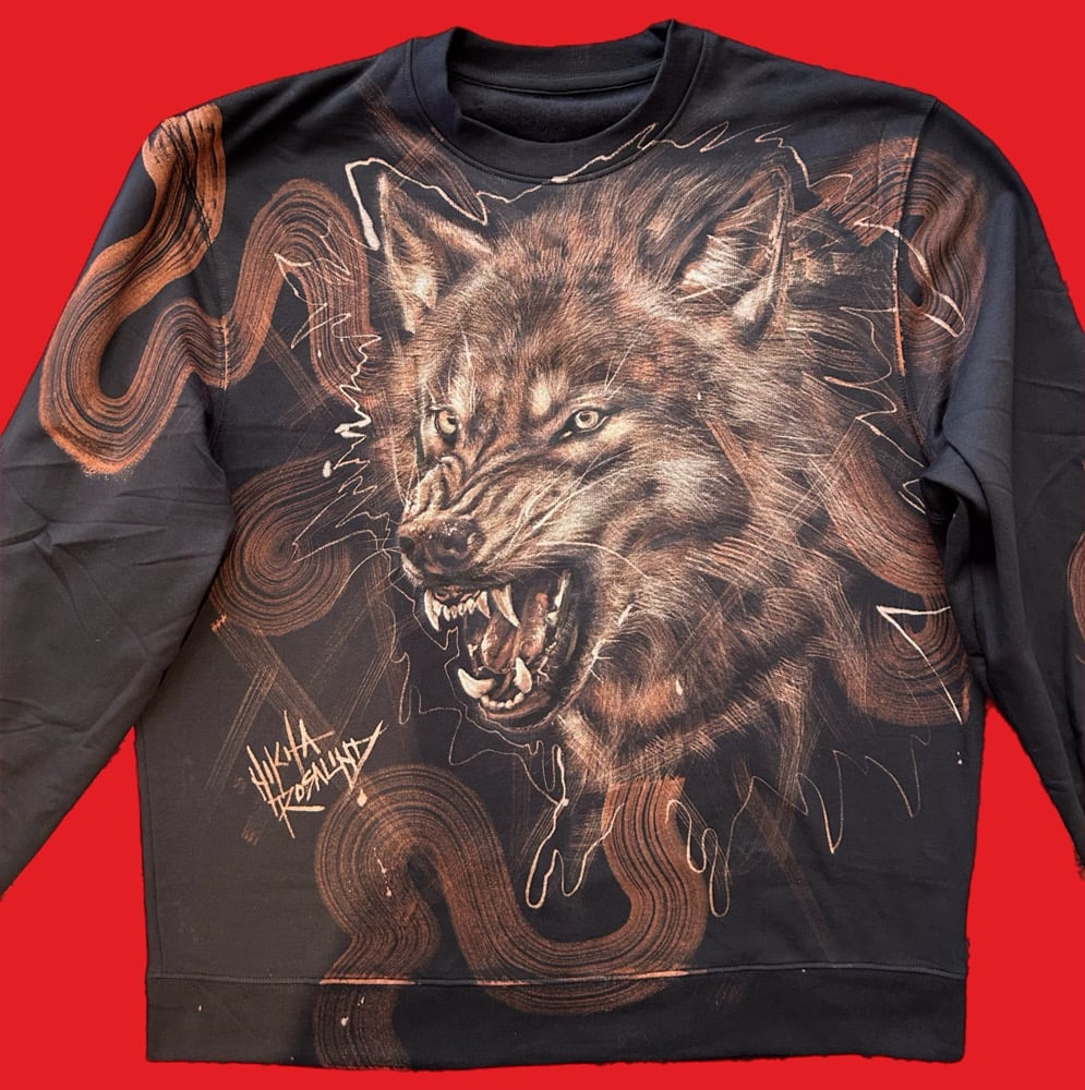 “SHE WOLf” One of a kind bleach painted pullover sweater with fleece interior. Created by Nikita Rosalind November 12th 2025