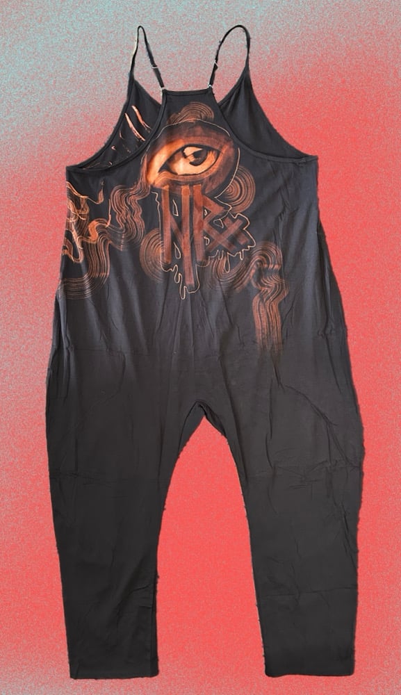 • Art you can wear! Free hand bleach painted baggy oversized romper. Truly a work of art on this piece. The image of this incredible dragon covering the entire side of the jumper. Show stopper!