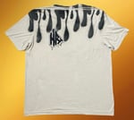 NR and black spray fabric paint drips on the shoulders on the back. Signed.