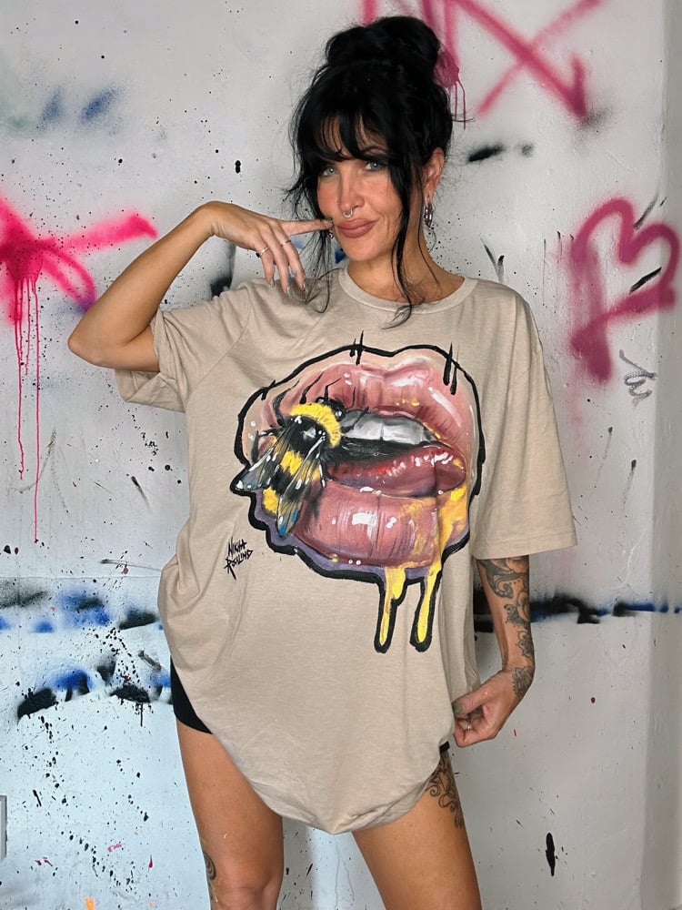 • This custom art tee is such a lovely wearable painting. My favorite lip and bumble bee design. The bright yellow honey pops off this tee.