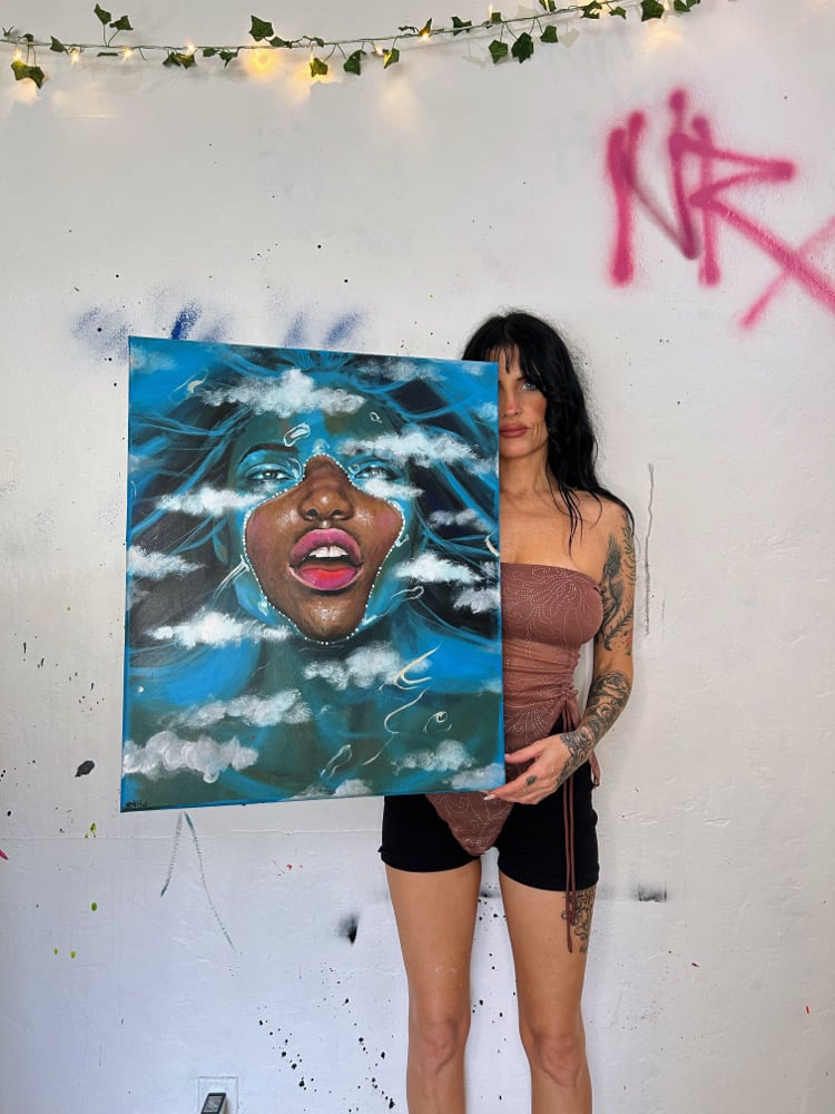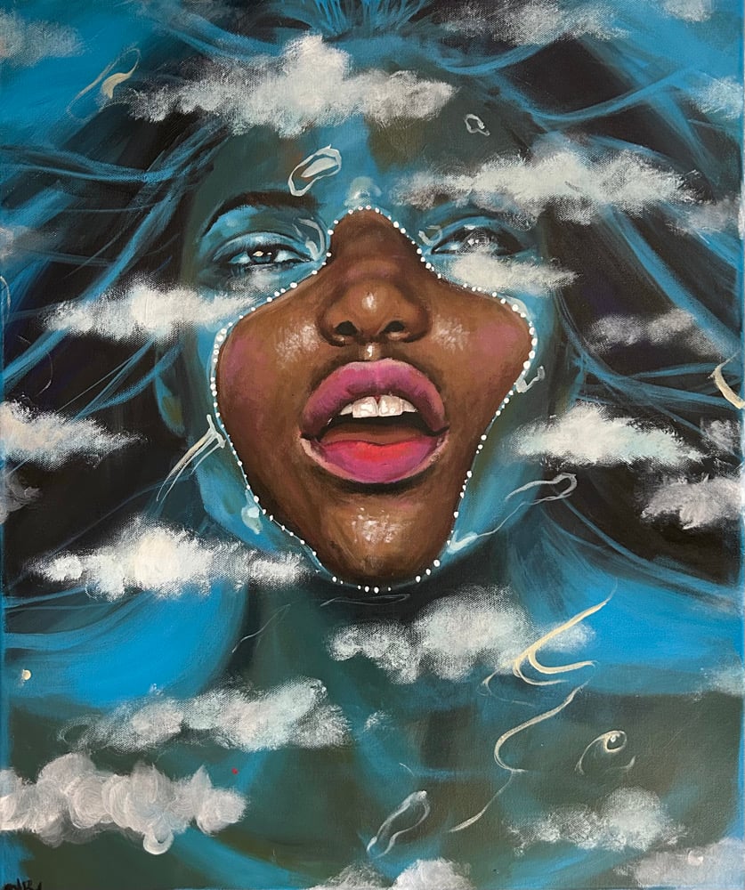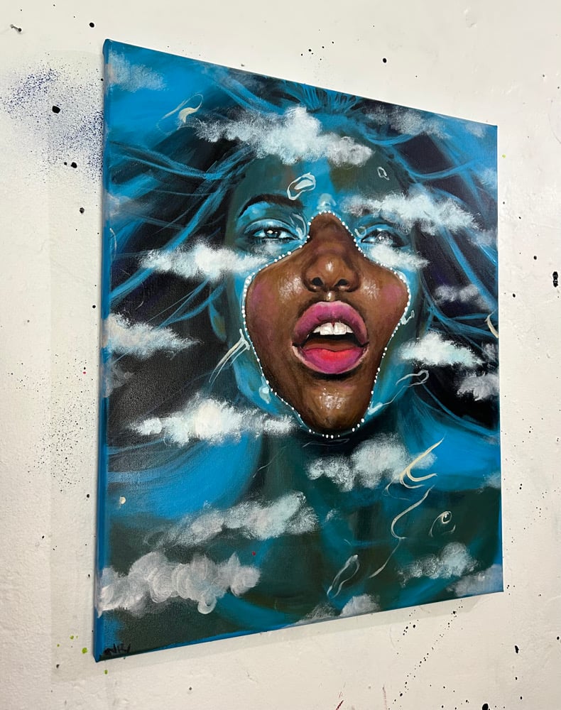 • This painting is glistening in the blue waters of reflection. Asking us to reflect on ourselfs to stay a float in life’s turbulent seas. She gasps at the air in urgency yet a sense of peace in her eyes.