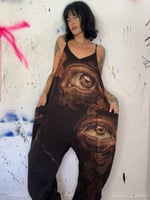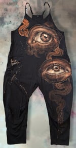 • Art you can wear! Free hand bleach painted baggy oversized romper. We love this signature wavy eye design, with two realistic eyes connected by waves.