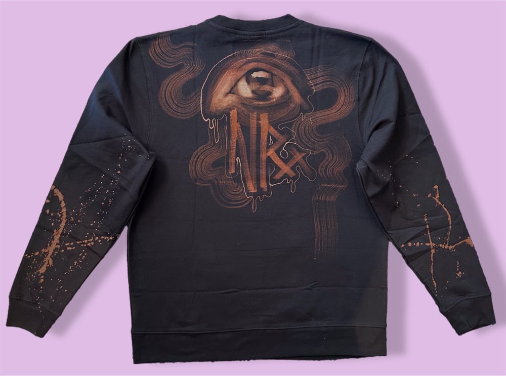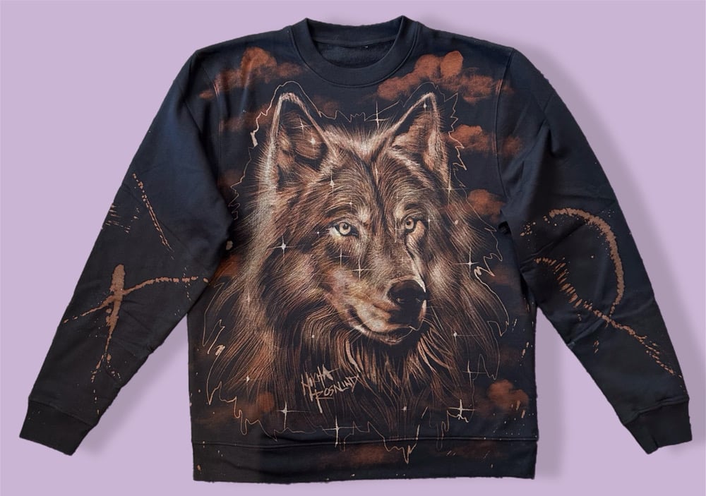 “WOLF” One of a kind bleach painted pullover sweater with fleece interior. Created by Nikita Rosalind November 19th 2025
